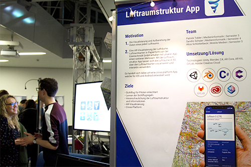 Ab in die Lüfte geht es bei der Luftraumstruktur App. Hinter dem Namen verbirgt sich eine Augmented Reality-Anwendung, die in Kooperation mit der Eisenschmidt GmbH (DFS - Deutsche Flugsicherung) entwickeln wurde. Diese App ermöglicht Piloten, interaktiv mit den Luftraumstrukturen Deutschlands zu interagieren und sich die Lufträume in 3D visualisieren zu lassen. Nicht nur erfahrene Piloten profitieren von dieser App. Auch Flug-Neulinge können sich dadurch schneller zurechtfinden und künftig auf gedruckte Papierkarten verzichten. Die Applikation wurde von Studierenden von Medieninformatik und Mobile Medien für iOS und Android entwickelt.