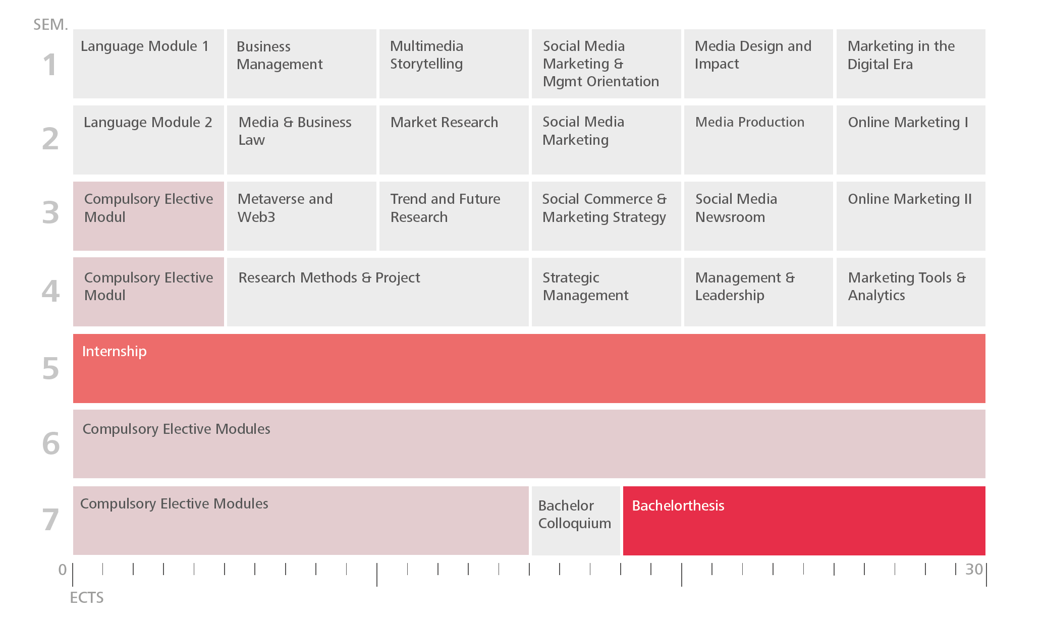 In the first two semesters (Year 1), you will be introduced to various aspects of social media marketing and management. You will develop a solid foundation in business, media production, law, and AI, which will be progressively expanded throughout the program. Assessment is primarily conducted through formal written exams, held at the end of each semester. Additionally, depending on your native language, you will take a language course in either German or English.