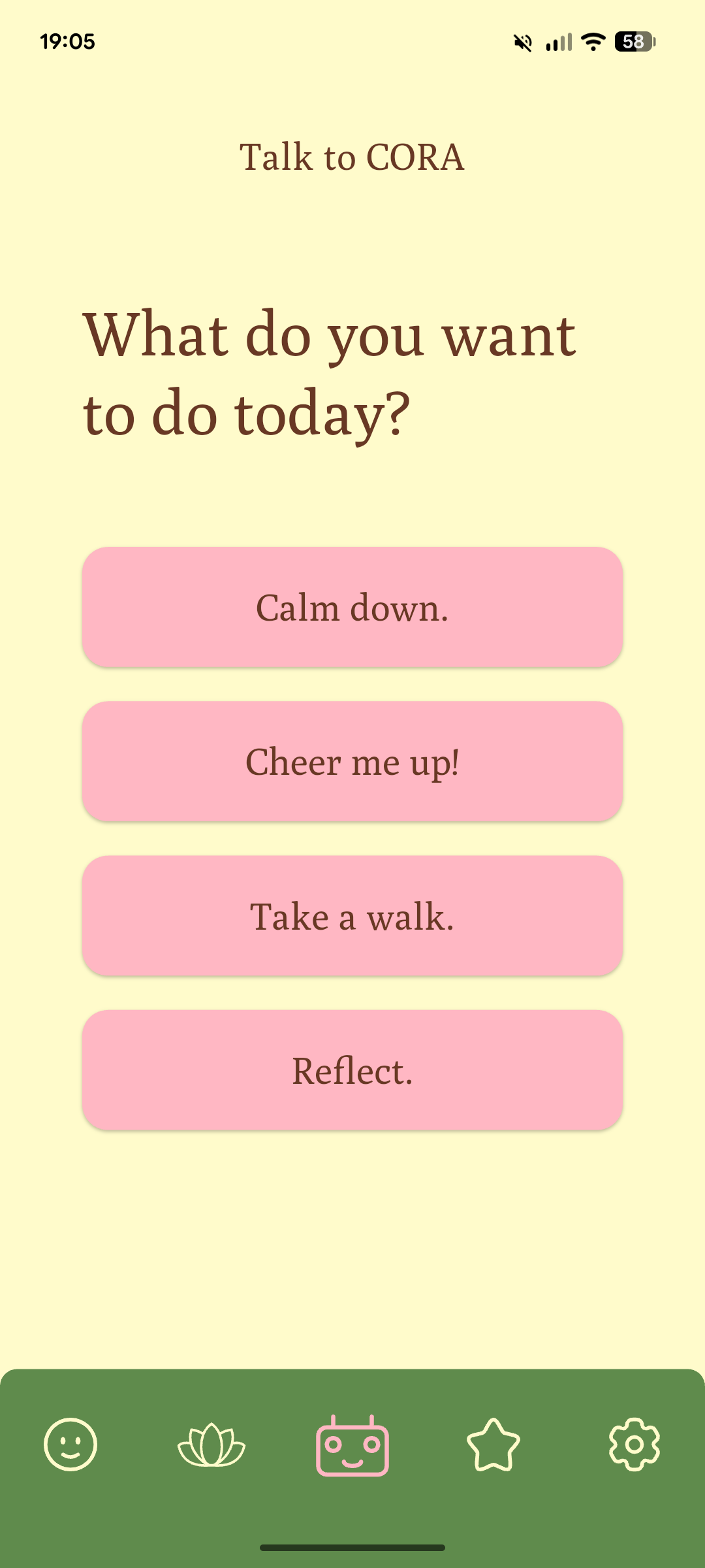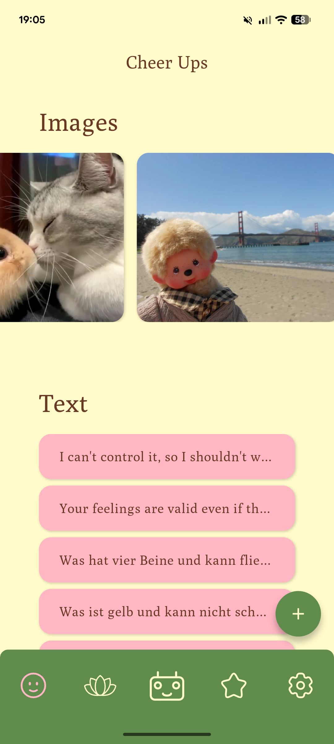 In der App können Bilder und Texte gespeichert werden, die dich aufheitern. Wenn es dir einmal schlecht geht, zeigt dir CORA deine persönlichen Inhalte um dich aufzumuntern!
