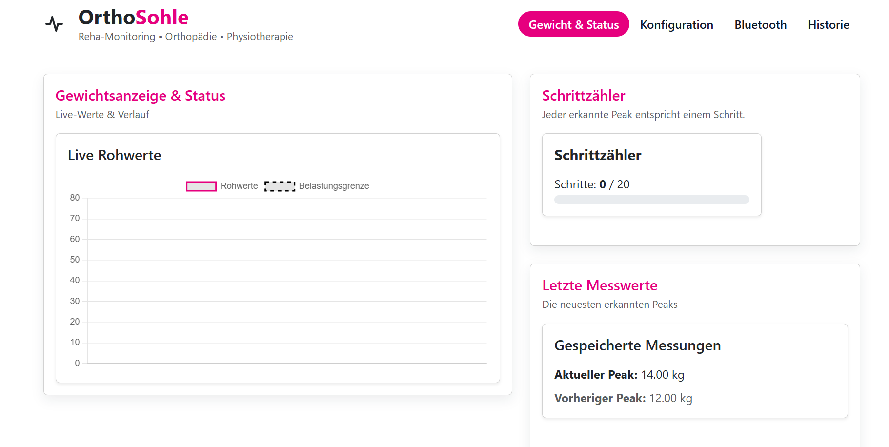 Die Orthosohle unterstützt Reha-Patienten dabei, die vom Arzt vorgegebene maximale Beinbelastung präzise und sicher einzuhalten. Dazu misst sie die aktuelle Belastung kontinuierlich in Echtzeit und übermittelt die Werte direkt an eine Smartphone-Anzeige, sodass der Nutzer jederzeit sofort erkennt, wie viel Druck gerade auf das Bein wirkt. Sobald die definierte Belastungsgrenze erreicht oder überschritten wird, reagiert das System unmittelbar: Über Benachrichtigungen auf dem Handy sowie über ein deutliches Vibrationssignal wird der Patient sofort gewarnt. So hilft die Orthosohle dabei, unbewusste Überlastungen zu vermeiden und den Heilungsverlauf optimal zu unterstützen.