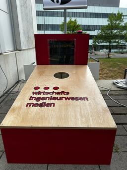 Ein Spiel, bei dem man kleine Säckchen durch ein Loch werfen muss, um Punkte zu sammeln. Die erreichten Punkte werden auf einer Anzeige angezeigt – wer als Erster drei Punkte erreicht, gewinnt und erhält einen Preis.
