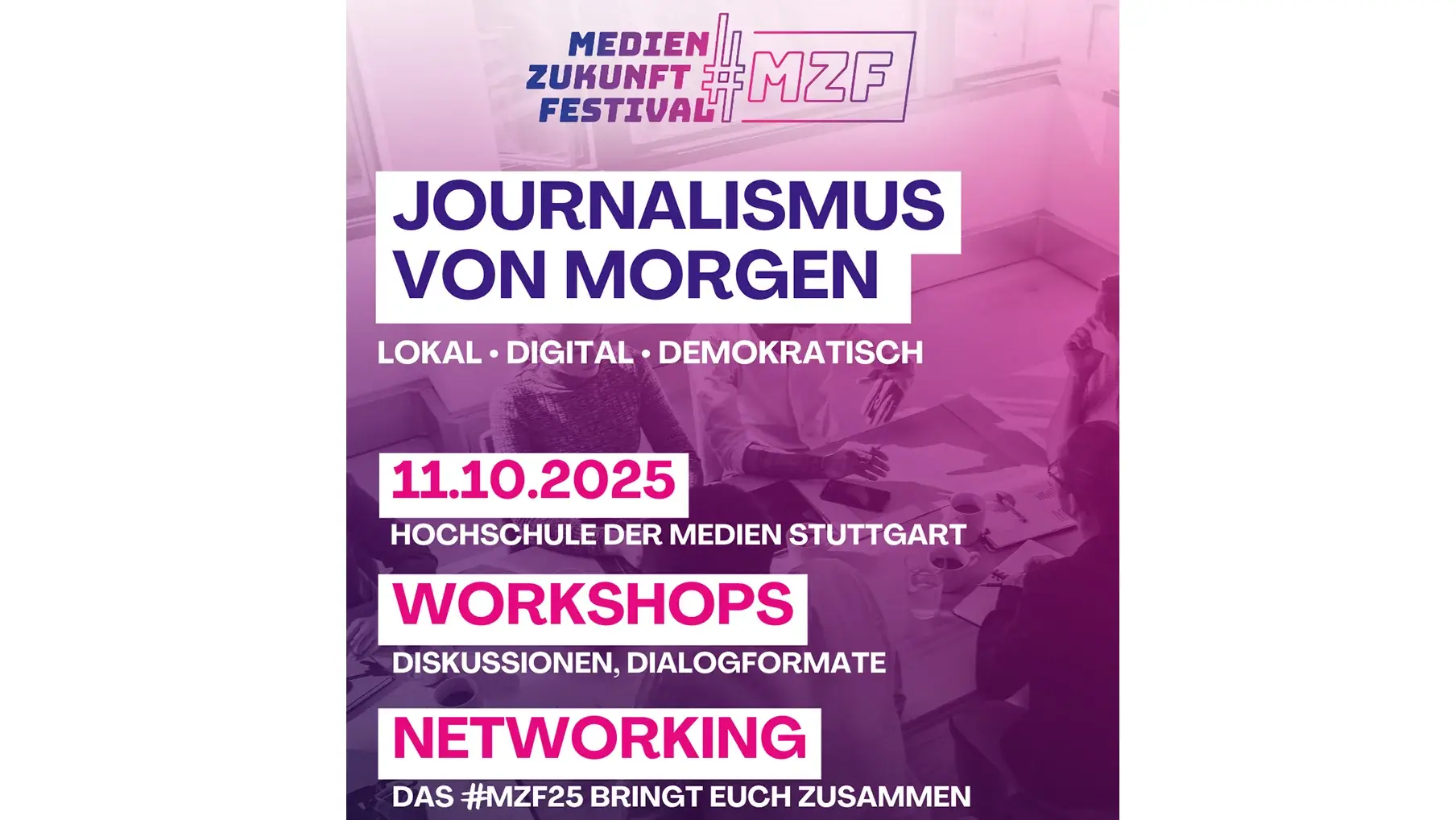Am 11. Oktober 2025 findet die siebte Auflage des Medien-Zukunft-Festivals an der Hochschule der Medien (HdM) in Stuttgart statt. Die Veranstaltung wird von der Hochschule der Medien, dem Deutschen Journalistenverband (DJV) Baden-Württemberg und der Journalistischen Aus- und Berufsbildung (JAB) organisiert.