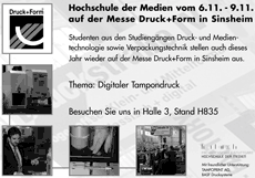 Die Messe Sinsheim hat für die Druck+Form das Konzept einer „Print Factory“ entwickelt: Auf vier Druckstraßen werden Produktionsabläufe vorgestellt, die abhängig von Auflage und Format mit Maschinen und Geräten verschiedener Anbieter bestückt werden. In Zusammenarbeit mit der HdM werden einige konzeptionelle Verbesserungen umgesetzt und innovative Akzente gesetzt.
