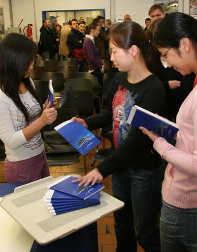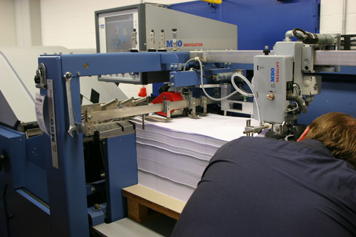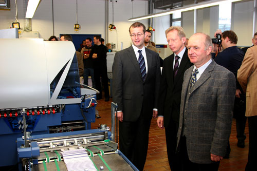 In einer Feierstunde wurden ein Planschneider Protec 115 von Wohlenberg, die dazu passende Peripherie von Baumann sowie eine Falzmaschine K 800 von MBO übergeben. Grußworte sprachen HdM-Rektor Professor Dr. Alexander W. Roos, Manfred Minich, MBO-Geschäftsführer, Volkmar Assmann, Geschäftsführer von Baumann, und Professor Dr. Rainer Nestler, Leiter des Buchbindereilabors im Studiengang Druck- und Medientechnologie der HdM. Live-Demonstrationen an den Maschinen sowie ein Steh-Empfang rundeten die Feier ab. Die Gäste konnten ein Schreibheft mit nach Hause nehmen, dessen Bogen vor Ort gefalzt und auf dem Klebebinder im DIN-A5-Format gebunden wurden.
