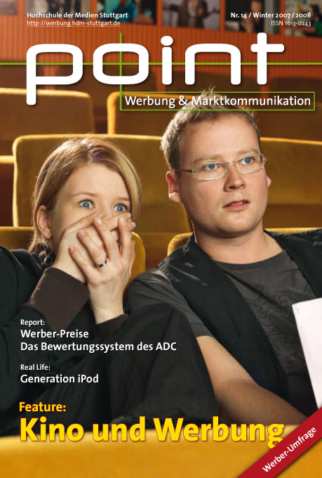 Dank guter Filme wie "Das Parfum" oder "Deutschland. Ein Sommermärchen" und nicht zuletzt der Oscar prämierte "Das Leben der Anderen" konnte sich das deutsche Kino in den letzten Jahren wieder deutlich erholen. Was macht den Reiz eines Kinobesuchs aus? Wie schaffen die Werber den Schritt ins ganz große Kino? "point" befasst sich mit den wichtigsten Fragen rund um die große Leinwand und zeigt Trends auf.