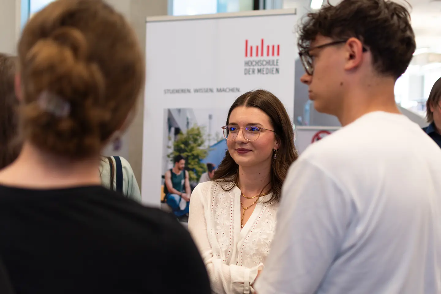 In the one-hour video chat with the Student Advisory Service, prospective students can ask open questions about applying and studying at the HdM. The group chat allows several participants to ask questions, which we answer as student counsellors.